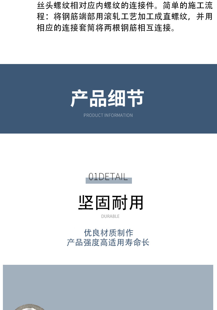 鋼筋套筒又名鋼筋接頭:用以連接鋼筋且具有與絲頭螺紋相對(duì)應(yīng)內(nèi)螺紋的連接件。簡單的施工流程:將鋼筋端部用滾軋工藝加工成直螺紋,并用相應(yīng)的連接套筒將兩根鋼筋相互連接。鋼筋套筒通常是用精密鋼管進(jìn)行生產(chǎn)的。專門用于生產(chǎn)鋼筋套筒的精密鋼管采用的是45#鋼材,通常又被稱為“鋼筋連接套管”。鋼筋套筒***可靠,連接方便,便于檢測(cè)。
